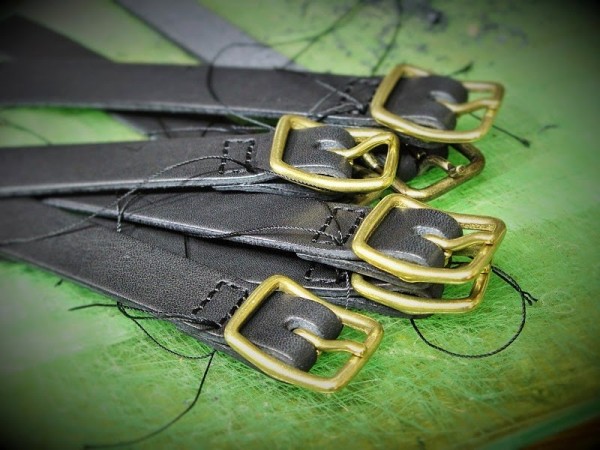 ベルト部分にバックルを取り付けます。バックルは私個人製作では真鍮製のバックルを使用しています。ここの取り付けはカシメてしまった方が圧倒的に早いのですが、ブーツにカシメの後が付いてしまいますので縫いで取り付け。